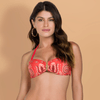A tendência boho folk print combina elementos de design boêmios e de inspiração folk para criar looks moda praia exclusivos e atraentes. Essa estampa incorpora a tonalidade vibrante do vermelho alaranjado Pitanga unindo à detalhes naturais, o que a torna uma escolha diferenciada. A técnica artesanal tem sido tendência confirmada há várias temporadas.