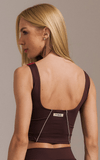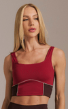 Na cor vermelho intenso, transmite energia, atitude e confiança; os detalhes em marrom profundo agregam sofisticação e aconchego, e o vivo off white destaca as curvas, tornando este top ideal para looks fitness que unem estilo, personalidade e performance.