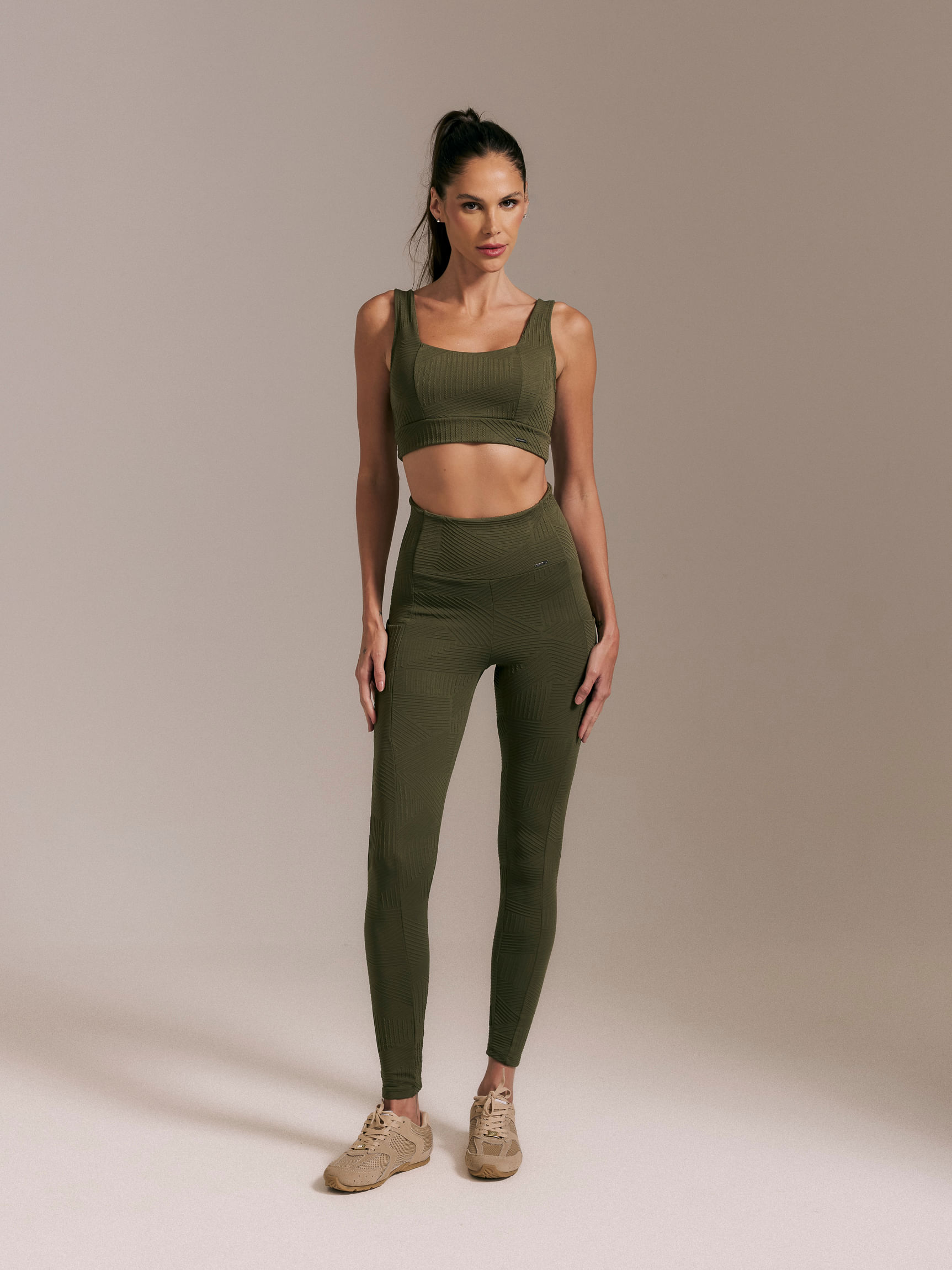 Versátil e atemporal, a legging verde musgo combina facilmente com tops,
